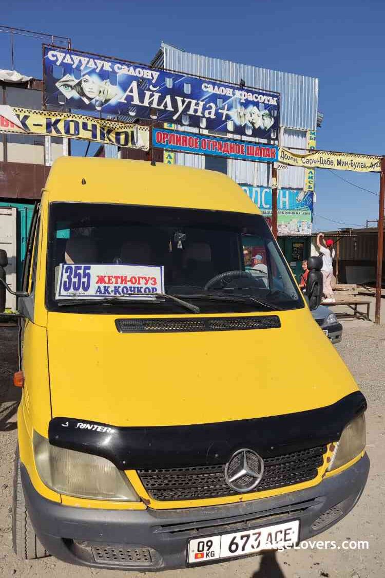 La marshrutka que va hasta Jeti Oguz habíamos leído que era la número 371 pero nosotros subimos a las 355. El tema es que según habíamos leído, esta furgoneta no llegaba hasta las montañas y se quedaba en el pueblo, pero ya os decimos que la 355 que nosotros utilizamos sí que nos dejó en las montañas. Hay que asegurarse que llega hasta Dzhety-Oguz Kurort (en ruso: жети огуз Kurort). Lo decimos porque lo que seria el pueblo de Jeti Oguz (Jeti Oguz Village) queda lejos de donde empieza la ruta para ver las montañas.